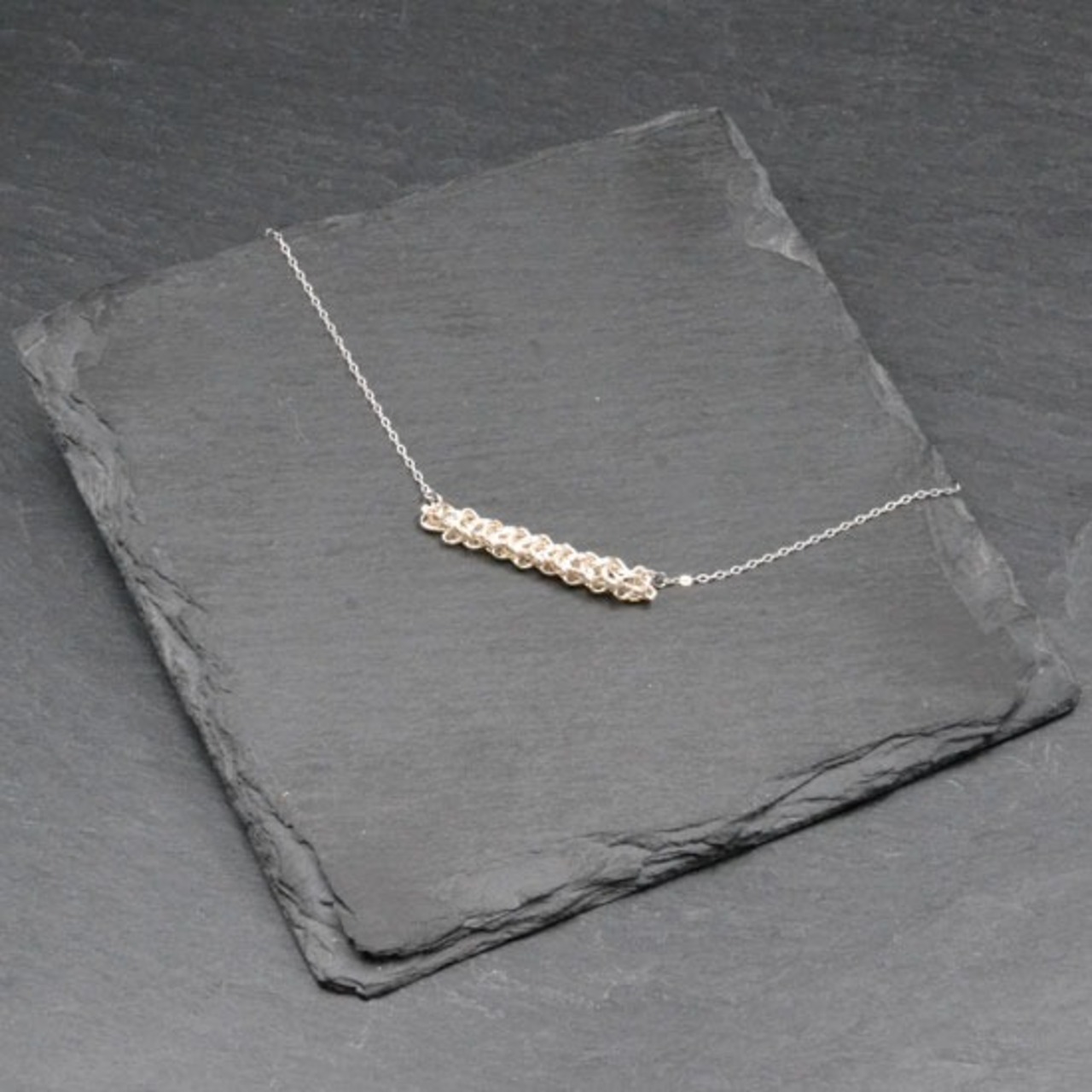 エビコード編みの技法を使ったアクセサリーでエレガントな仕上がりになっています。