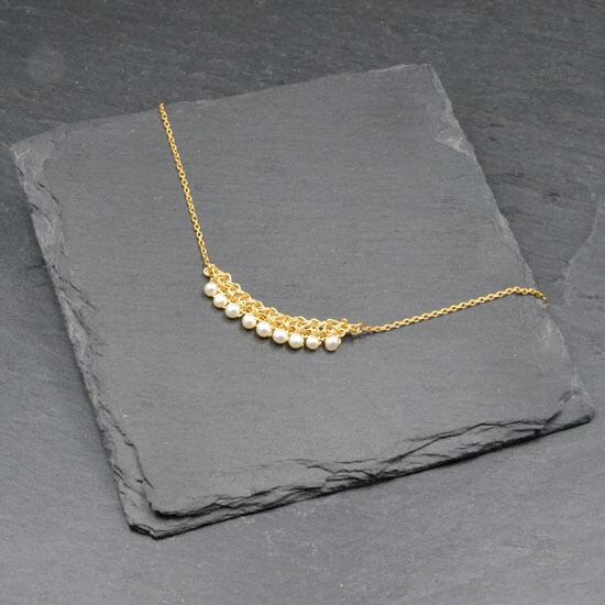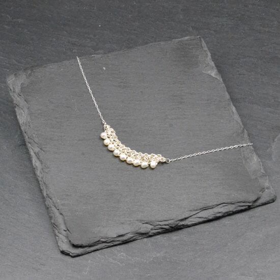 エビコード編みの技法を使ったアクセサリーでエレガントな仕上がりになっています。